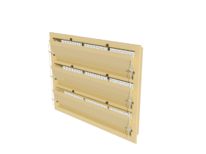 This tunnel unit is built up out of tree single 6000-VFR inlets. This version is equipped with a straight inner valve that guides the air upwards during minimum ventilation. After opening further than 35% the air will also flow underneath the inner valve. This unit is controlled by side arms that connect the inner valves.